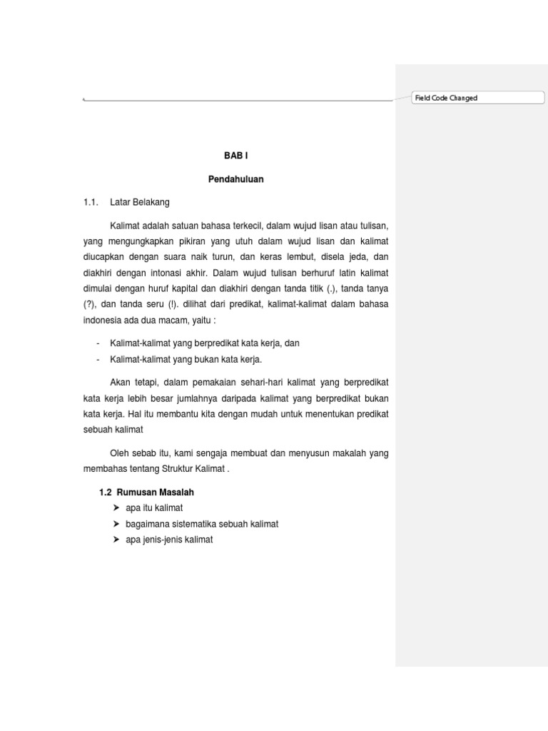 Makalah bahasa indonesia tentang tentang kalimat posted by : Kalimat perintah adalah kalimat yang bertujuan memberikan perintah kepada orang. Pada dasarnya, sebuah kalimat dapat dibentuk oleh klausa yang terdiri atas subjek dan predikat dengan penambahan objek, pelengkap, maupun keterangan yang diakhiri dengan tanda baca titik (.), tanya (?), atau seru (!). Menjelaskan sejarah pembentukan pemerintah ri pasca proklamasi. Dapatkah saudara membacakan makalah ini, seandainya saya tidak dapat meneruskan!